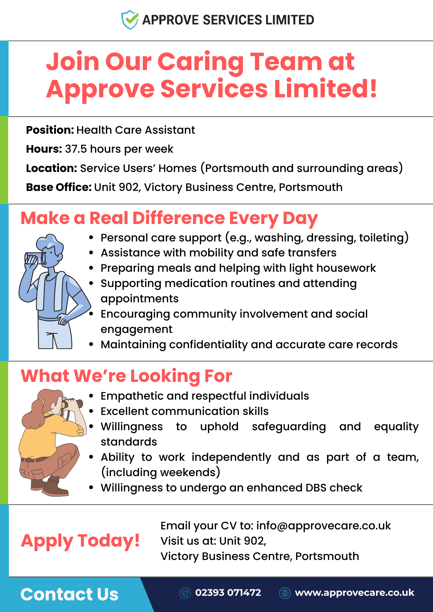 Approve Services Limited specializes in providing registered nurses, support workers, and healthcare assistants to the health and social care sector. We supply agency nursing and care staff to health and social care providers and operate as a Care Quality Commission (CQC) registered provider of home care (domiciliary) services.